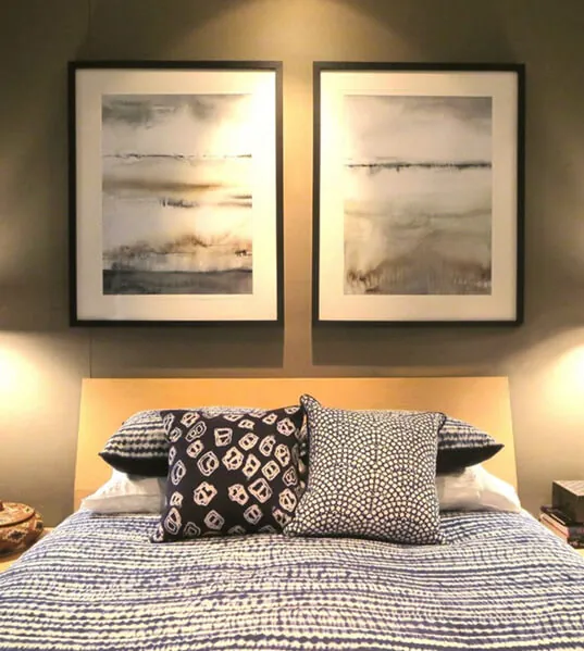 If you have numerous artworks in a room, hung separately (not in a group), don’t try to level up the works at the top or the bottom of each frame, stick to the centre of each artwork being at your eye level, and your artworks will make your room come alive!"