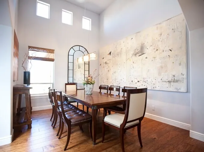 "Art is all about placement. The center of a piece should be at an average person's eye level... and it doesn't have to be hung like it's a museum! Be adventurous and layer your art. Place decorative objects on a console in front of the art and create depth and perspective. Here's a little secret... it brings more attention to the art itself."